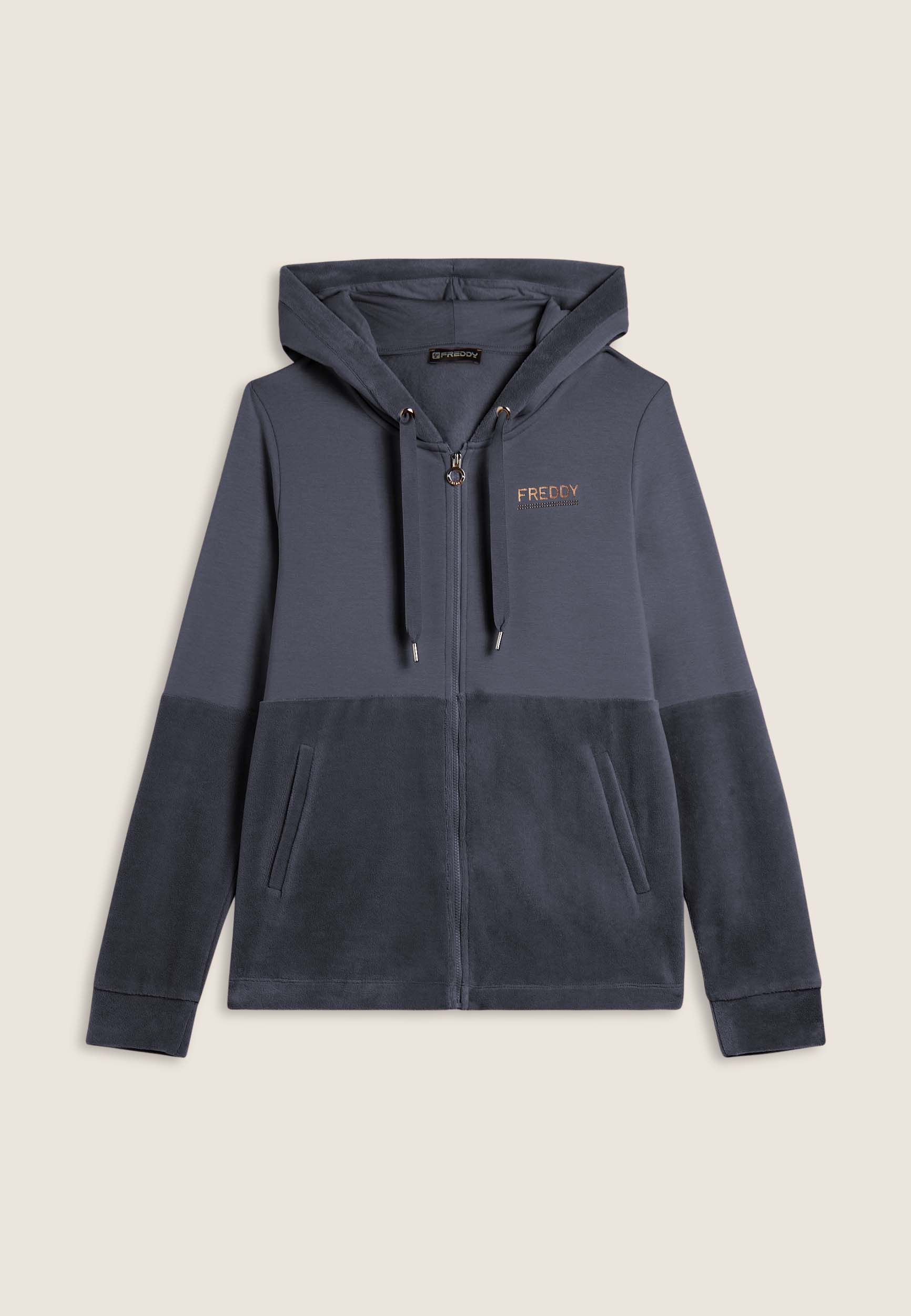 Ein Damen-Sweatshirt, das Komfort und Eleganz vereint. Die obere Hälfte des Rumpfes und der Ärmel besteht aus elastischem, gebürstetem Modalfleece, während die Unterseite des Rumpfes und der Ärmel sowie der Kapuzenrand aus Samt für einen eleganten Touch gefertigt sind. Es verfügt über einen durchgehenden Reißverschluss, eine gefütterte Kapuze und ein FREDDY-Logo, das mit zweifarbigen Strasssteinen verziert ist.