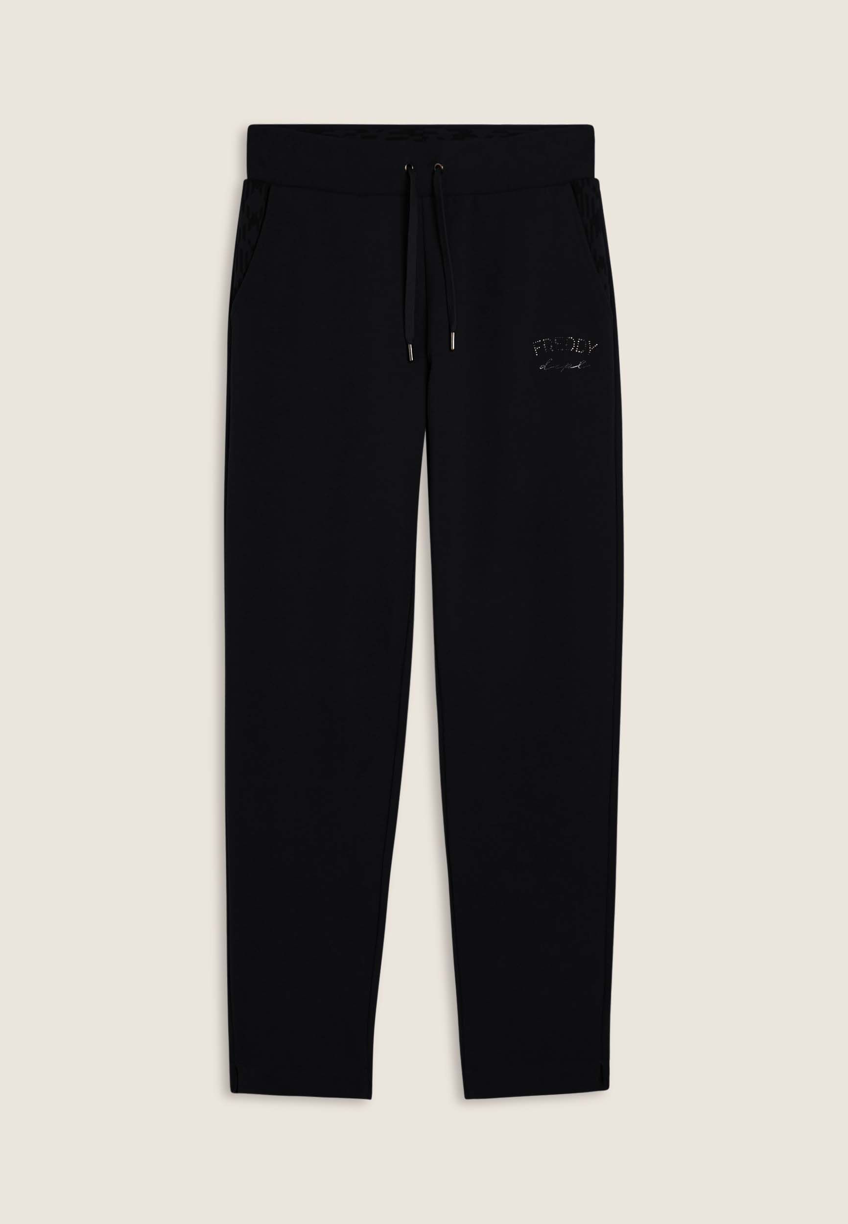 Trainingshose im Regular Fit mit geradem Bein und kleinen Seitenschlitzen für mehr Bewegungsfreiheit. Der normale Bund ist mit einem Kordelzug versehen, die Innenseiten der Taschen und der Bund sind mit einem geometrischen Muster verziert. Das FREDDY-Logo mit Nieten ziert die linke Seite. Schräge Innentaschen.