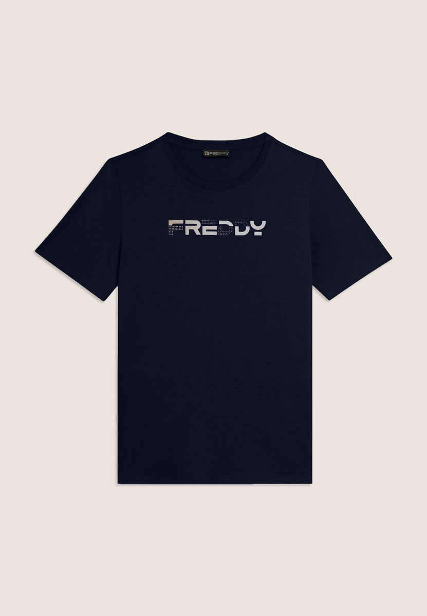 T-Shirt mit kurzen Ärmeln für außergewöhnlichen Komfort, mit Rundhalsausschnitt und geradem Saum. Das Logo FREDDY, das in hellrosa holografischen Effekten auf der Vorderseite gedruckt und mit Perlen in derselben Farbnuance verziert ist, ist ein Detail, das es einzigartig macht. Der leichte Jersey-Stoff aus Baumwolle und Polyester ist weich, atmungsaktiv und strapazierfähig, ideal für leichte Sportarten und alltägliche Aktivitäten.