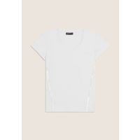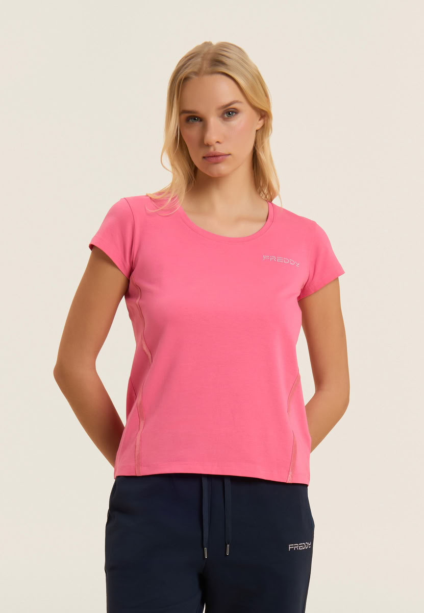 T-Shirt mit kurzen Ärmeln, Rundhalsausschnitt und sehr kurzen Ärmeln, mit einem schlichten, aber eleganten Design. Das FREDDY-Logo aus hellrosa Perlen auf der Brust und die seitlichen elastischen Einsätze mit glänzendem Finish schmücken es elegant. Die reguläre Passform und der gerade Saum machen es bequem und vielseitig, geeignet für den Alltag. Hergestellt aus leichtem, dehnbarem Baumwolljersey bietet es langanhaltenden Komfort.