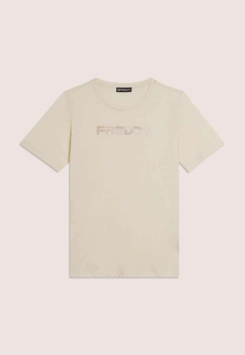 T-Shirt mit kurzen Ärmeln für außergewöhnlichen Komfort, mit Rundhalsausschnitt und geradem Saum. Das Logo FREDDY, das in hellrosa holografischen Effekten auf der Vorderseite gedruckt und mit Perlen in derselben Farbnuance verziert ist, ist ein Detail, das es einzigartig macht. Der leichte Jersey-Stoff aus Baumwolle und Polyester ist weich, atmungsaktiv und strapazierfähig, ideal für leichte Sportarten und alltägliche Aktivitäten.