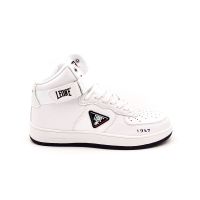 Leone 1947 Apparel Straps Damenschuh. Hoher Damenschuh mit dreieckigem Patch und seitlich aufgenähter dreifarbiger Flagge, auf der Zehenseite aufgedrucktem Jahressymbol und auf der Rückseite des Schuhs in Kontrastfarbe aufgedrucktem Löwensymbol.