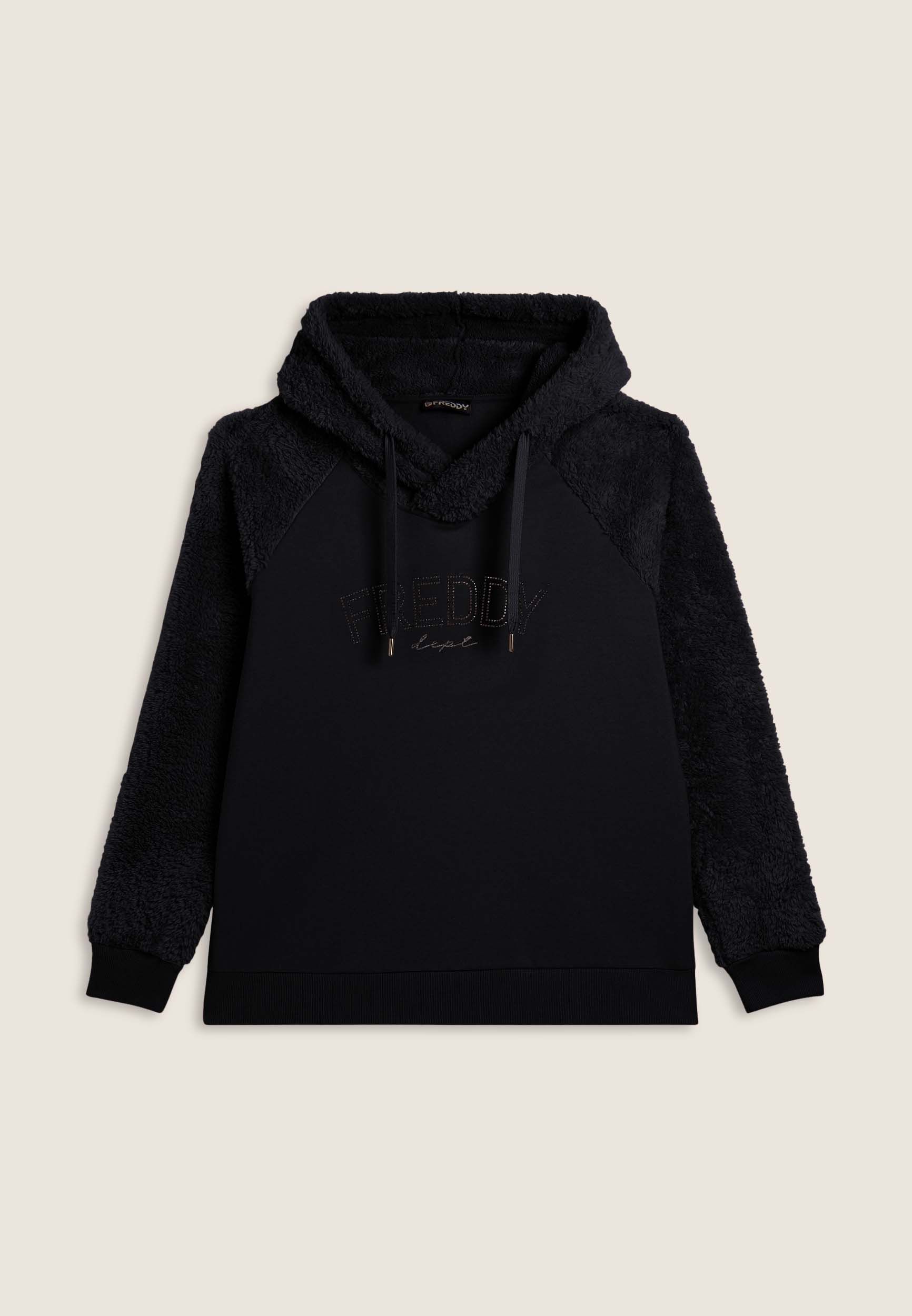 Felpa sportiva da donna realizzata in felpa garzata elasticizzata con maniche e cappuccio in pile sherpa. Cappuccio incrociato con coulisse, fondo con spacchi laterali in costina e grande logo FREDDY in borchie sul fronte. Senza tasche