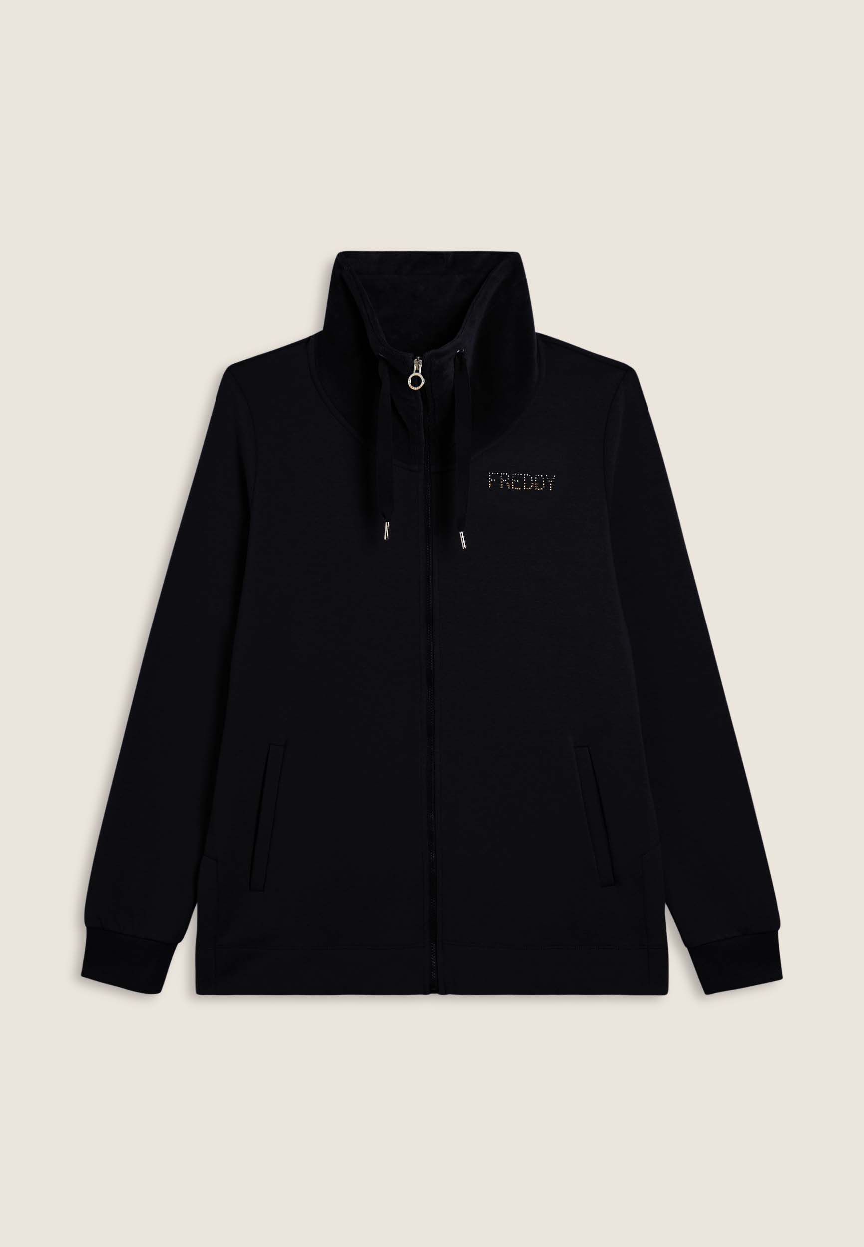 Felpa sportiva da donna con collo alto in velluto e struttura in felpa modal garzata elasticizzata. Ha una vestibilità regolare, fondo con spacchi laterali e chiusura full-zip. Gli strass bicolori decorano il logo FREDDY sul cuore e gli spacchi, donando un tocco brillante e femminile.