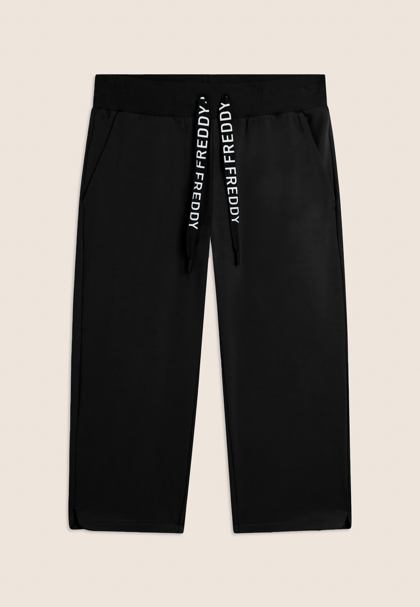 Pantaloni sportivi corsaro con fondo stondato e vita in costina con coulisse logata FREDDY. Il logo FREDDY in bianco glitter è posizionato sul fianco posteriore sinistro per un tocco inaspettato. Realizzati in jersey pesante stretch di cotone, garantiscono comfort e vestibilità ottimale.