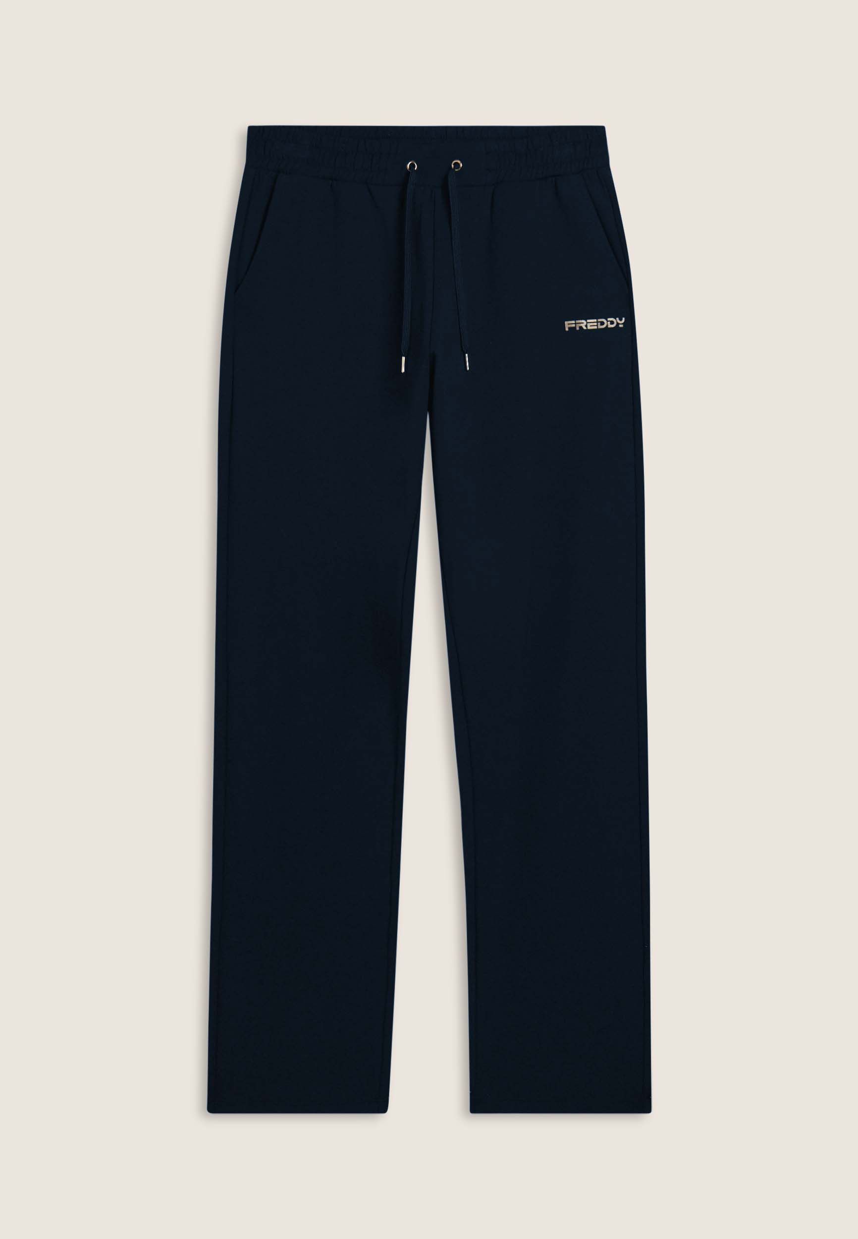 Pantaloni donna in felpa garzata elasticizzata con vestibilità regular e gamba dritta. Vita regular con elastico interno e coulisse per una regolazione comoda. Il modello è completato da tasche alla francese e piccolo logo FREDDY stampato sul fianco sinistro