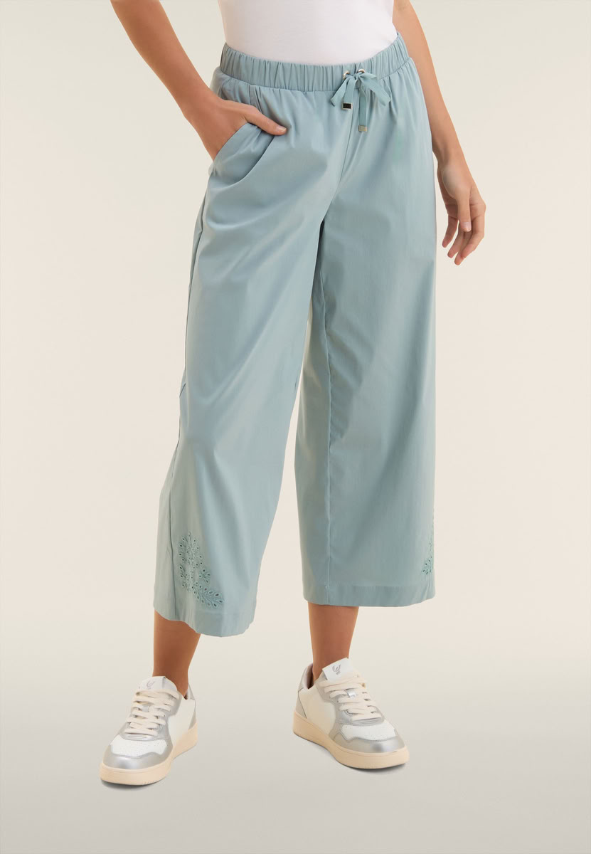 Pantaloni cropped dalla vestibilità comfort e taglio wide leg, con vita regular dotata di coulisse ed elastico interno per un effetto arricciato. Il fondo è decorato su entrambi i lati da un ricamo floreale stile sangallo, che dona un tocco romantico e sofisticato. Le tasche interne alla francese e la placchetta dorata con logo FREDDY sull'apertura della tasca sinistra completano il design. Realizzati in Popeline elasticizzato, offrono comfort e una vestibilità comoda con un look fresco e femminile.