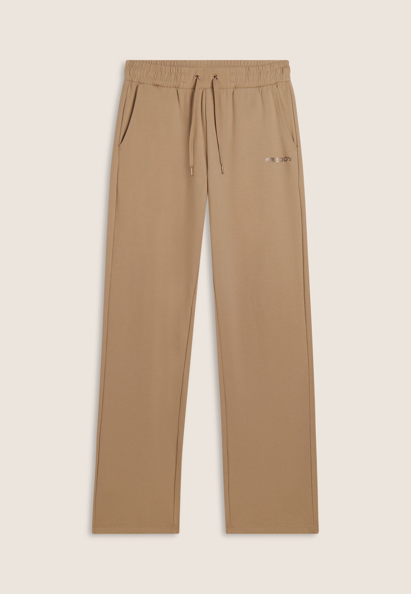 Pantaloni donna in felpa garzata elasticizzata con vestibilità regular e gamba dritta. Vita regular con elastico interno e coulisse per una regolazione comoda. Il modello è completato da tasche alla francese e piccolo logo FREDDY stampato sul fianco sinistro