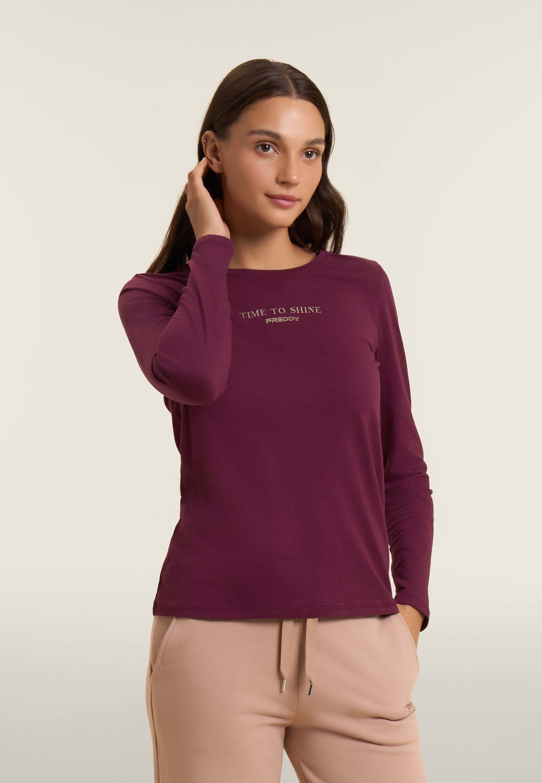 Freddy T-Shirt manica lunga con banda logata sulle spalle Bordeaux da Donna