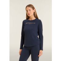 T-shirt donna in jersey Supima con vestibilità comfort e fondo leggermente stondato. Le maniche lunghe e lo scollo girocollo completano un look pulito. Il fronte è decorato da una grafica oro chiaro con logo FREDDY in strass, per uno stile sobrio ma brillante.