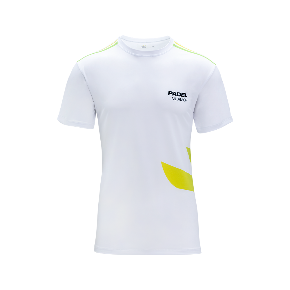 La maglietta padel uomo ICON bianca, interamente Made in Italy, è realizzata in tessuto tecnico traspirante bielastico ad asciugatura rapida. La sua vestibilità dalle linee morbide dona grande comfort e permette massima libertà di movimento. Le strisce orizzontali sulle spalle e la grande P sul fianco di colore giallo-verde, conferiscono forza e personalità.